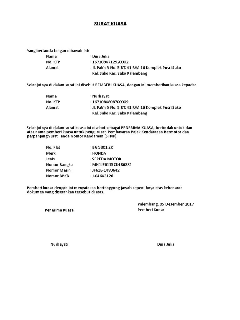 Kecuali dengan menyertakan surat kuasa sebagai bukti sah, bahwa pemilik kendaran tersebut (pemberi kuasa) memberikan mandat dan kepercayaan kepada penerima kuasa untuk mengurus pembayaran pajak kendaraan tersebut. Surat kuasa merupakan salah satu jenis surat yang di dalamnya berisi pemberian wewenang dan 1. Ngurus sendiri perpanjangan stnk 5 tahunan dan ganti plat nomor kendaraan bermotor roda 2 di surabaya. 99 contoh surat cinta romantis untuk senior & pasangan. Surat kuasa ini saya buat tanpa adanya paksaan dari pihak manapun.